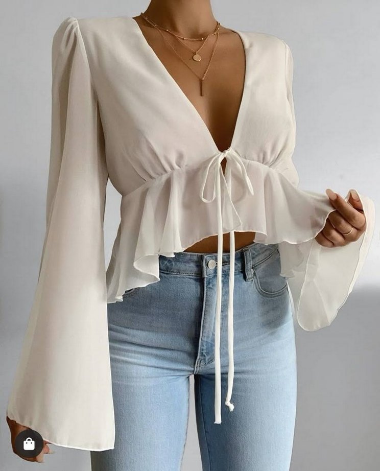 Beyaz, straplez yakalı ve uzun kollu, yumuşak keten kumaştan yapılmış drapeli bohem tarzda dar kesim bluz, günlük kullanım için uygun.
