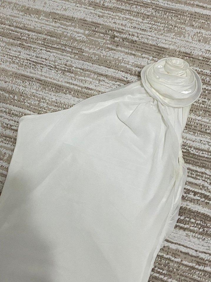 Beyaz, tek omuzlu ve drapeli tasarıma sahip bu uzun abiye, tekne yaka ve vücuda oturan kesimiyle düğünler ve bohem tarz için uygundur.