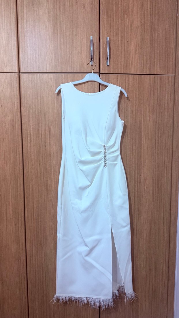 Kolsuz, beyaz, drapeli detaylı ve yırtmaçlı uzun abiye elbise. Straplez yaka ve modern klasik tarzda, düğün için uygun.