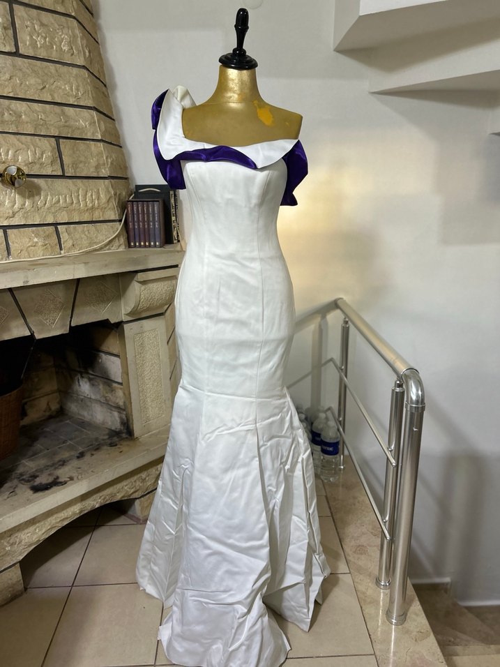 Beyaz uzun abiye elbise, askısız yakası ve drapeli detaylarıyla dikkat çeker. Regular fit ve kolsuz tasarıma sahiptir. Avant-garde tarzda, düğün için uygundur. 34-36-38 bedenler için uygundur.