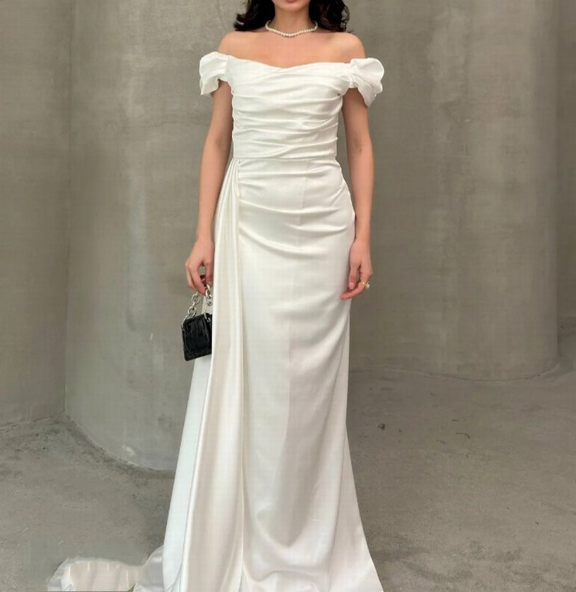 Beyaz renkte, drapeli ve straplez yaka detaylı uzun abiye elbise. Regular kesim ve klasik modern tarzda, düğün için uygundur. ✨