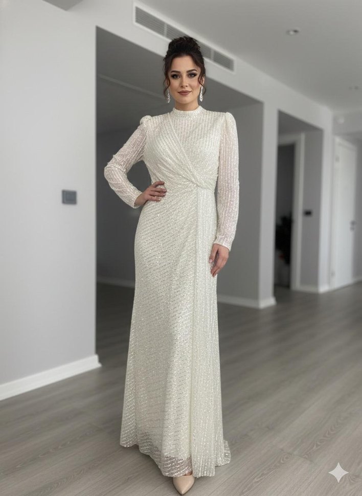 Beyaz uzun abiye elbise, tek düze ve drapeli tasarıma sahip, tekne yaka ve uzun kolludur, düzenli kesimdir.