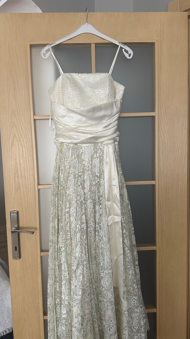 Beyaz renkte, drapeli bel detayına sahip uzun abiye elbise. Dantel ve saten dokusu vintage ve modern klasik tarzı birleştirir.