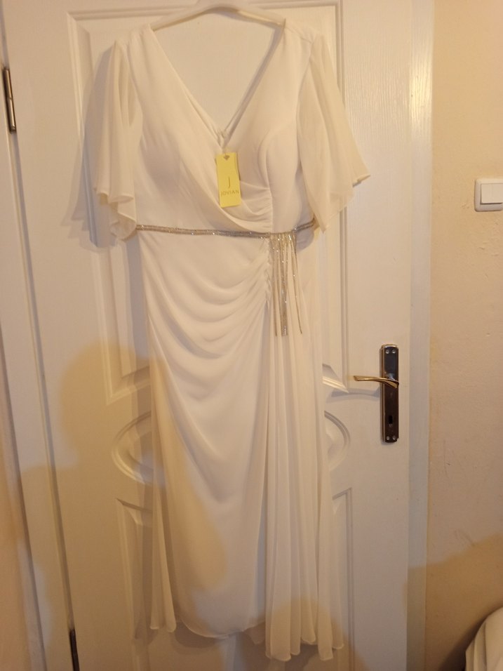 Bu beyaz abiye elbise, V yakalı ve kısa kollu drapeli tasarıma sahiptir. Rahat kesimli ve modern klasik stilde olup, düğünler için uygundur. İnce desenli ve Paris tarzını yansıtan kemer detayı bulunur.