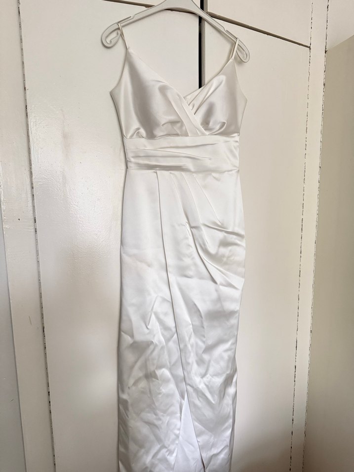 Drapeli, V yaka ve kolsuz beyaz abiye elbise. Fitted kesim ve parlak kumaş, düğünler için modern klasik tarzda.