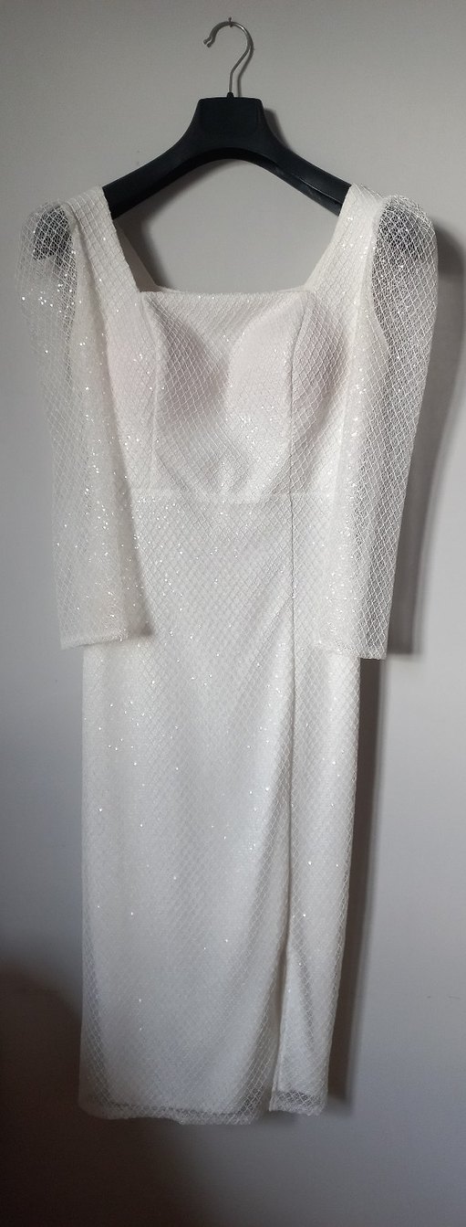 Bu beyaz abiye elbise, tekne yaka ve drapeli detaylara sahiptir. İnce askılı kollu, parlak ve desensiz kumaştan yapılmıştır, düğünler için uygundur. 38 beden fakat terziye verildi. 36 olmuş olabilir. 2 kere giyildi.