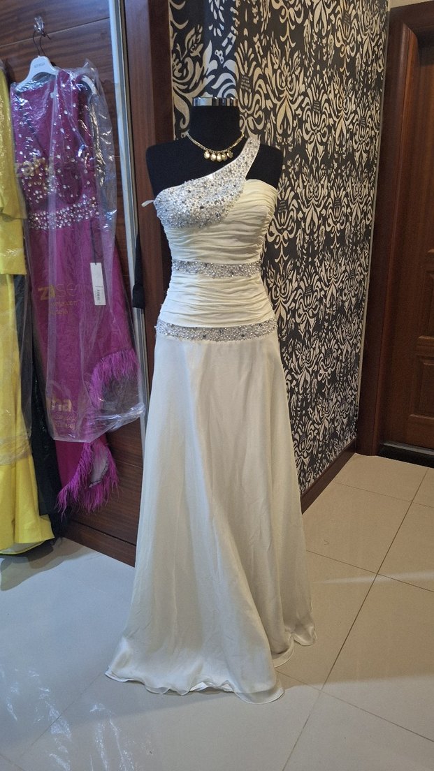 Askılı olmayan, kolsuz beyaz abiye elbise, drapeli ve nakışlı detaylara sahip, düzenli kesim ile düğün ve özel geceler için uygundur. 40 beden uygun verilicektir
