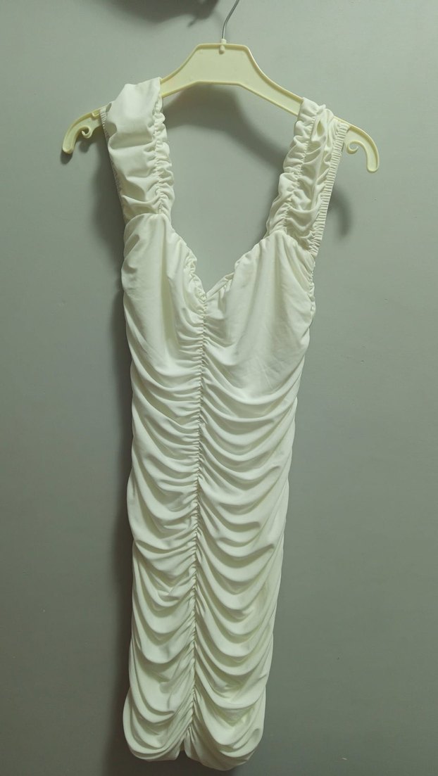 Beyaz, kolsuz, V yakalı, drapeli detaylara sahip, uzun ve vücuda oturan bohem tarzda gece elbisesi.