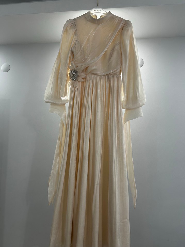 Bej rengi Drapeli Uzun Bohem Straplez Nişan Elbisesi