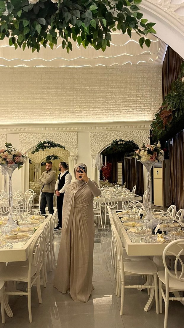 Beyaz, drapeli ve etnik desenli straplez uzun nişan elbisesi. Modern klasik görünüm için regular fit ve ince askılı kollar içerir.