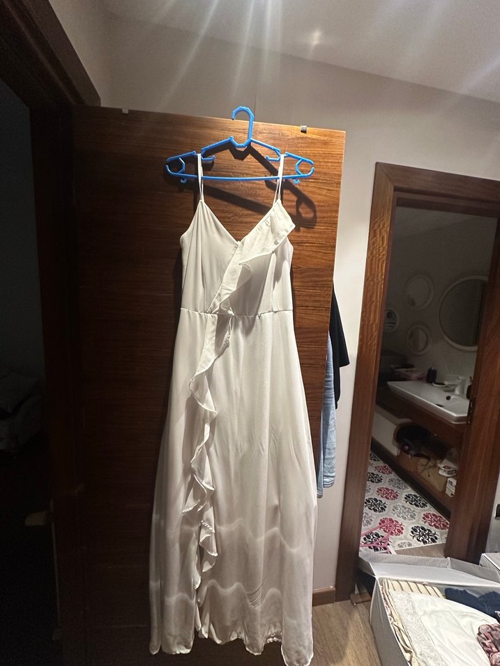Çekimde 1 kez kullanıldı, Beyaz uzun elbise, V yaka ve ince askılı, drapeli tasarıma sahip. Bol kesim ve minimalist bohem tarzda, düğün için uygun.