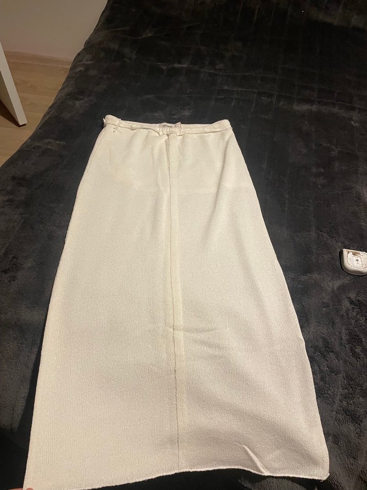 Beyaz renkte, drapeli detaylara sahip uzun ve dar kesim kadın eteği, yumuşak sentetik kumaştan üretilmiştir. Minimalist ve normcore tarzını yansıtır. ⚪