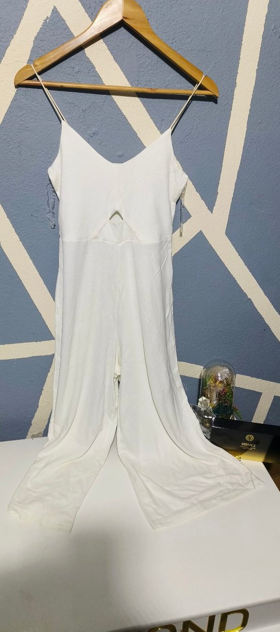 Beyaz renkli, drapeli ve V yakalı uzun tulum. Kolsuz ve ince kumaştan, sokak stili ve athleisure tarzını yansıtır, düğün için uygun.
