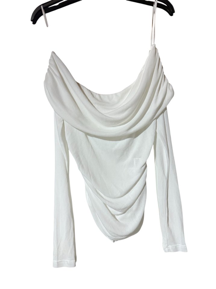 Beyaz kumaştan, drapeli tekne yaka ve uzun kollu, kısa ve vücuda oturan minimalist tarzda bluz. Günlük kullanım için uygundur. S ve M mevcut