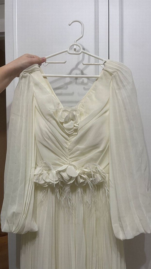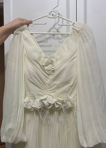 Drapeli tasarımı ve V yakasıyla beyaz, uzun kollu, fitted nişan elbisesidir. Bel kısmında çiçek ve tüy detayları bulunan bohem tarzda şık bir modeldir. Ön kısımdaki çicek tokalı olduğu için çıkartılabilir. Bir kez giyildi ve defosu yoktur.