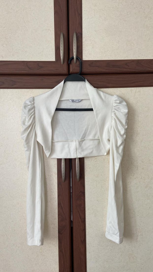 Beyaz sentetik kumaştan uzun kollu, drapeli ve vücuda oturan bolero, klasik ve bohem tarz için uygun. 12 yaş