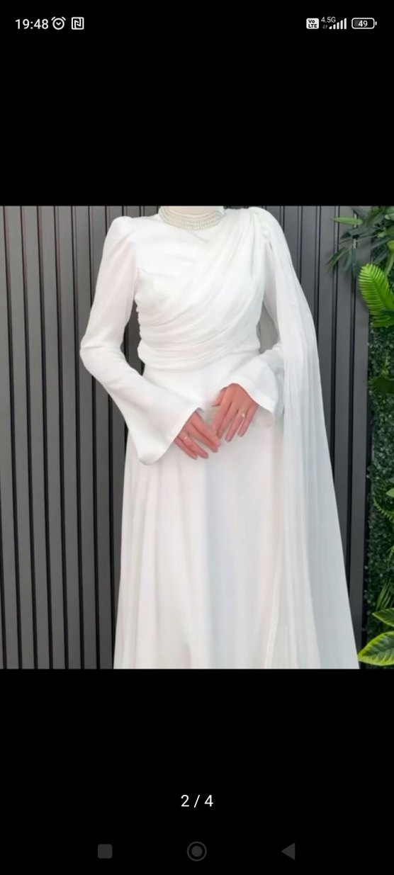 Beyaz renkte, drapeli detaylı, uzun kollu ve kadın abiyesi. Modern klasik tarzda, sade ve mütevazı kesime sahip, uzun boyda şal eldiven şapka ile gönderilecektir hiç bir kusuru yoktur