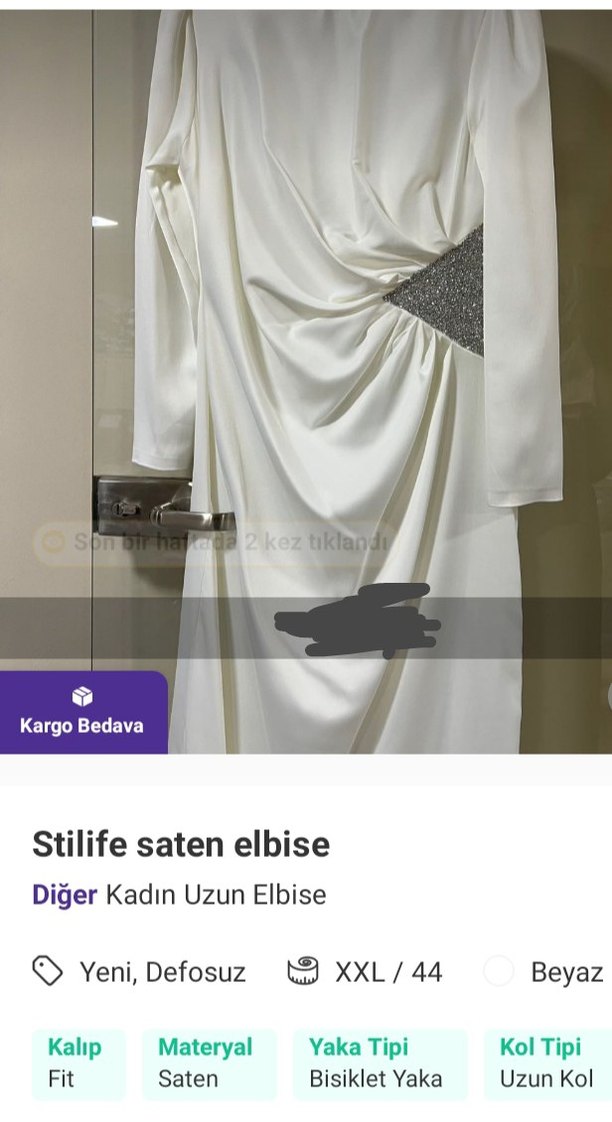 Sadece 1 sefer giyildi.Beyaz saten kumaştan, uzun kollu ve drapeli detaylı,düğün için uygun, modern kesimli 44 (XXL) beden elbise dilerseniz daraltabilirsiniz kalıbı dar kalıp olduğu için bilerek 1 beden büyük aldım.(67 kiloda giyildi fakat 73 kiloya kadar olur esnek kumaştır.)