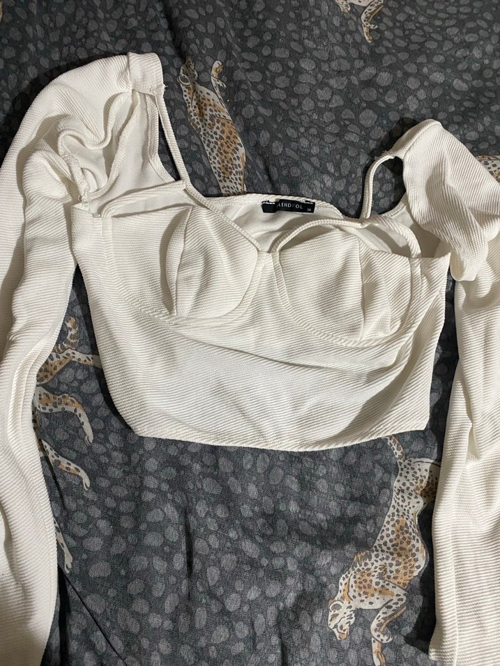 Beyaz, straplez yakalı ve drapeli tasarıma sahip, uzun kollu ve vücuda oturan bu bluz, yumuşak sentetik kumaştan üretilmiştir. Trendy sokak stili için uygundur.