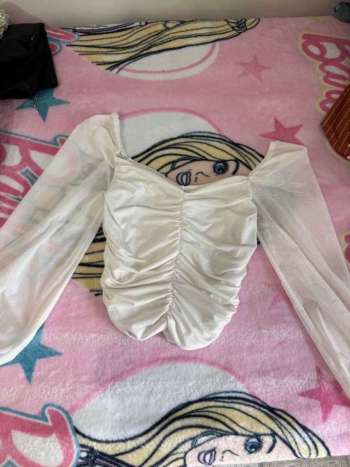 Beyaz, fitted straplez bluz, uzun ve transparan kollu, drapeli ve büzgülü ön detaylı, midi boy, bohem tarzda.
