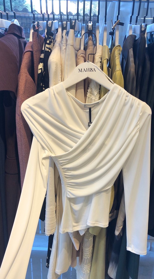 Beyaz, drapeli ve uzun kollu, V yaka tasarıma sahip, ince kesimli ve uzun boy bluz. Sentetik dokusu ile çağdaş Paris tarzını yansıtır. Günlük kullanım için uygundur. 34/36/38/42
