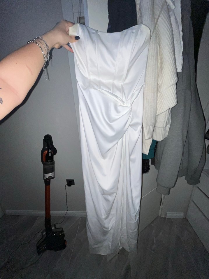 Bu beyaz abiye elbise, straplez yakası ve drapeli detaylarıyla minimalist ve şık bir görünüm sunar, düğünler ve mezuniyetler için uygundur.
