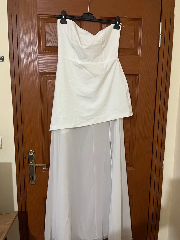 Beyaz, straplez ve kolsuz uzun elbise, drapeli detaylara sahip. Sentetik kumaştan, bol kesim ve minimalist tarz için uygun. Düğünlerde şık bir seçenek.
