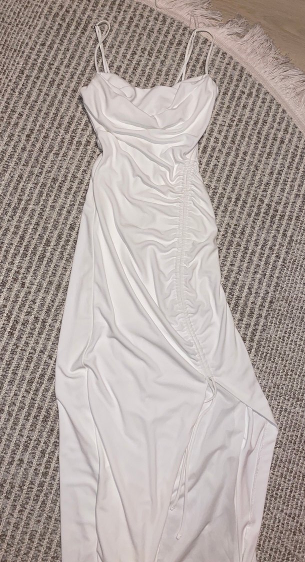 Beyaz renkte, drapeli esnek kumaş uzun elbise. Sentetik yumuşak kumaştan, minimal ve bohem tarzda, düğün için uygun.
