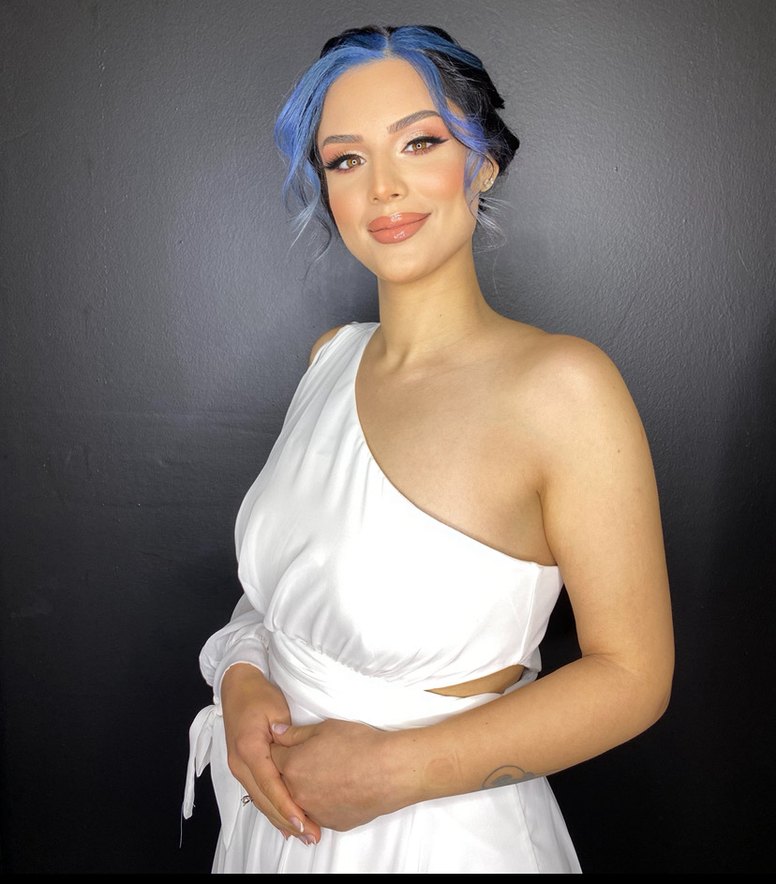 Beyaz renkli, tek omuzlu yakalı, drapeli ve askılı kollu mini abiye. İnce kesimi ve hafif batik deseniyle dikkat çeker.