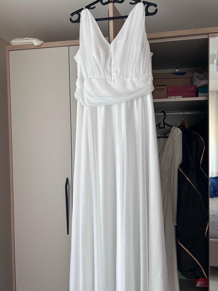 Drapeli tasarımı, V yakası ve salaş kesimiyle beyaz, kolsuz uzun elbise. Pürüzsüz sentetik kumaştan, modern klasik tarzda düğün için uygun.