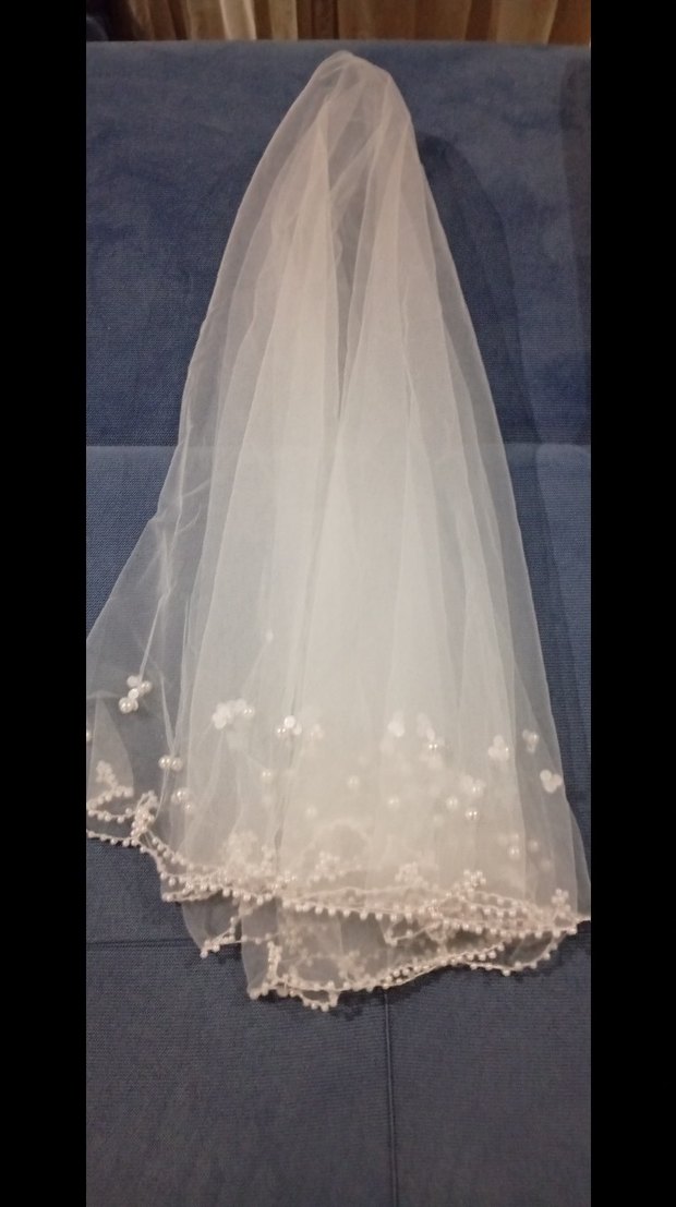 Beyaz drapeli gelin duvağı, kenarlarında zarif çiçek nakışlarıyla klasik vintage şıklık sunar.