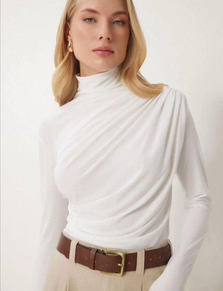 Beyaz renkte, yüksek yakalı ve drapeli detaylı, uzun kollu, vücuda oturan sentetik kumaştan yapılmış kadın bluz.
