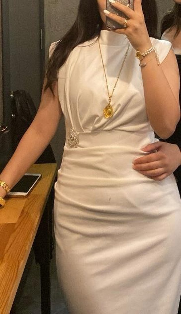 Beyaz, yüksek yakalı ve kolsuz kalem elbise, belde drapeli detaylarla modern klasik bir şıklık sunar. Diz boyu uzunlukta ve desensizdir. içi gozukmemesi icin astarı vardır