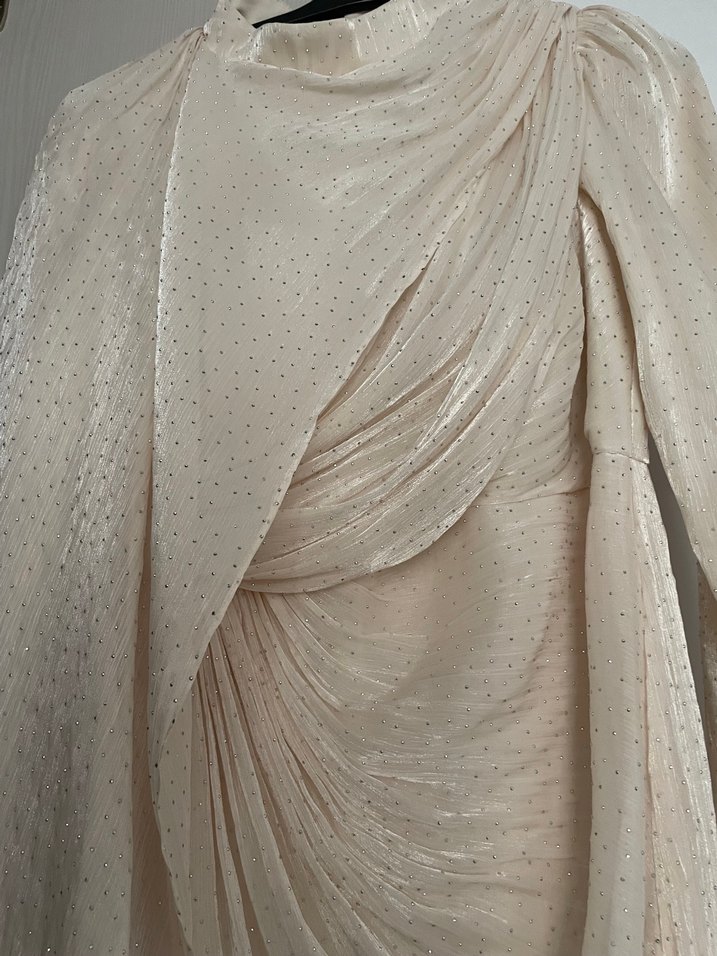 Drapeli, yüksek yakalı ve uzun kesime sahip beyaz abiye. Parlak kumaşı ve ince askılı kollarıyla çağdaş ve avant-garde tarzda şık bir tasarım. Bir kaç saat giydim hennin markasına ait bir ürün normal 42-44 giyiniyordum ama bunu 46 beden aldım çümkü dar kesim bi model ilgilenen olursa yardımcı olurum