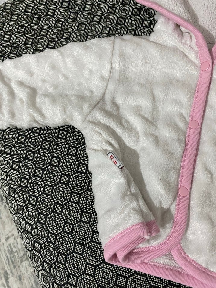 Bebek hırka, V yakalı ve düğmeli. Nakış detaylı, yumuşak ve sıcak kumaştan, pastel beyaz renkte, pembe kenarlıklıdır. ❄️