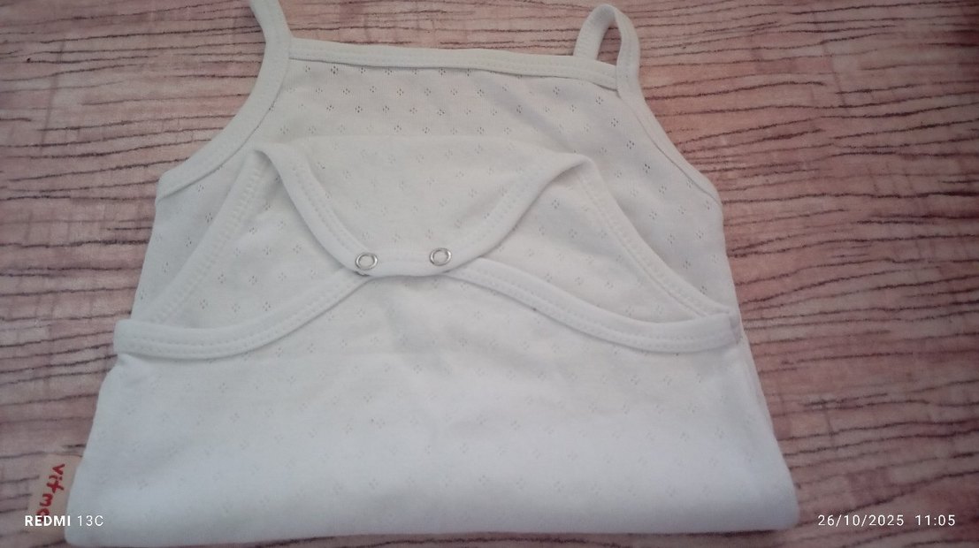 Beyaz renkte, düğmeli, kolsuz bebek kız body. Yuvarlak yaka ve pastel tonlarda, hafif dokulu desene sahiptir.