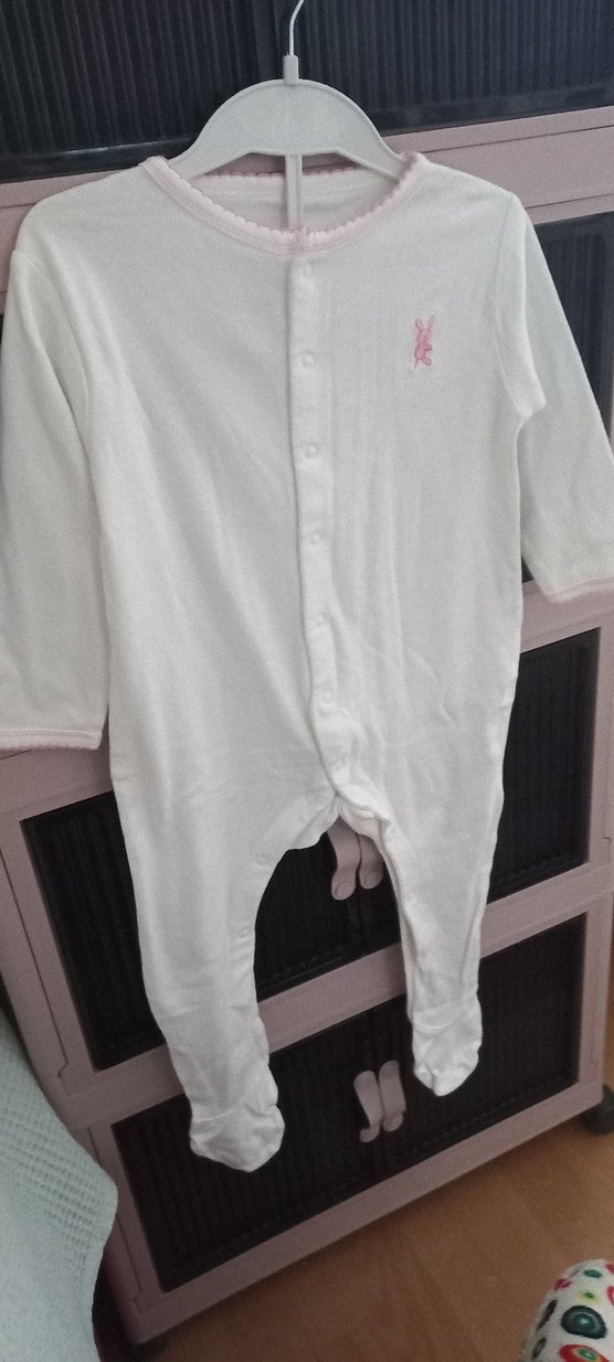 Düğmeli, pastel beyaz renkte, küçük pembe detaylı, desensiz bebek kız tulumu.