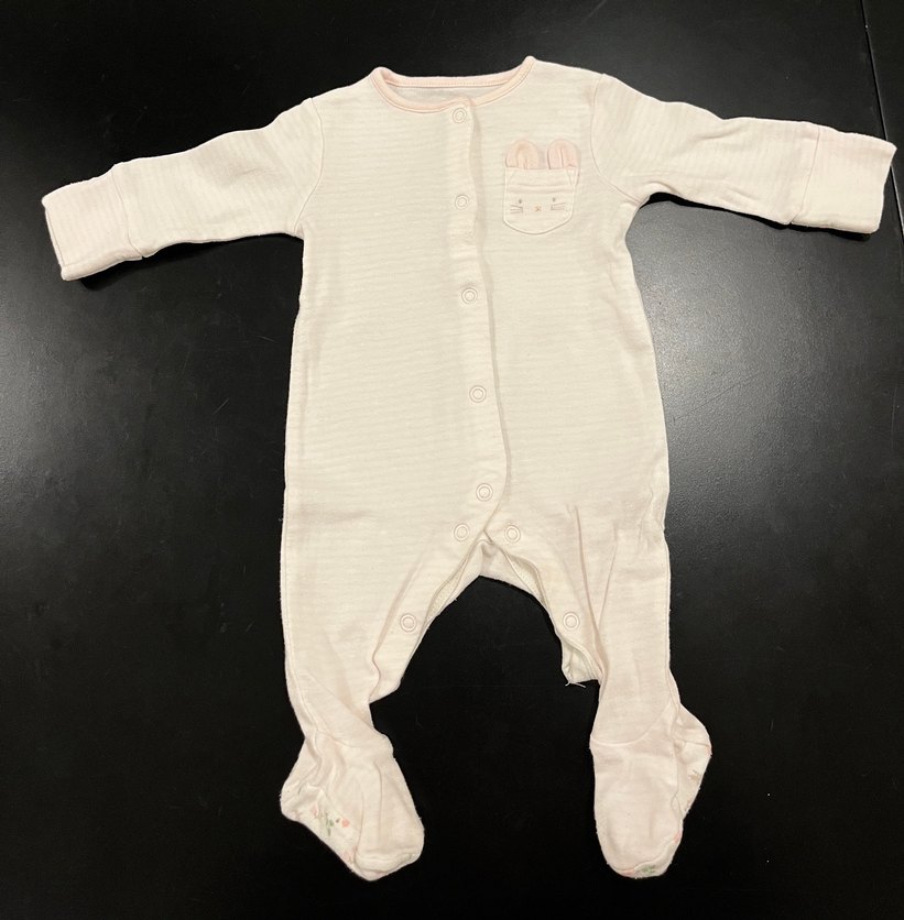 Pastel beyaz renkte, uzun kollu bebek tulumu. Önde düğmeleri ve küçük, tavşan yüzü desenli cep bulunur. 1-2 ay için uygundur