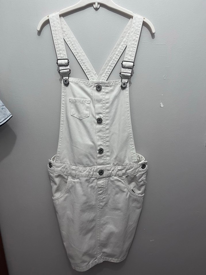 Beyaz, düğmeli ve ayarlanabilir askılı, günlük rahat kullanıma uygun fitted kısa denim elbise.