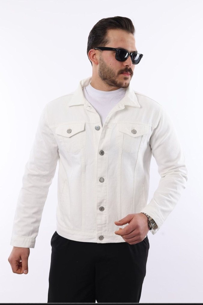 Beyaz denim kumaştan, düğmeli ve kesik yaka detaylı uzun kollu erkek ceket. Rahat kesimi ve sade tasarımıyla günlük kullanıma uygun.Temiz ve kusursuz.Ölçüleri fotoğraflarda eklidir.