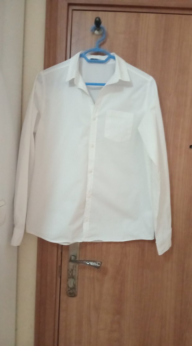Uzun kollu, düğmeli, yakalı ve göğüs cebine sahip beyaz pamuk erkek çoçuk gömleği.bir defa giyildi yeni gibi , iki koltuk arası 50 cm, omuzdan boyu 64 65 cm.