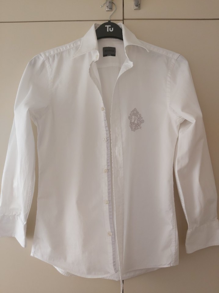 Düğmeli, yakalı ve uzun kollu beyaz erkek gömleği. Pamuk kumaştan, normal kesim ve parlak görünüme sahip, ofis kullanımı için uygundur.