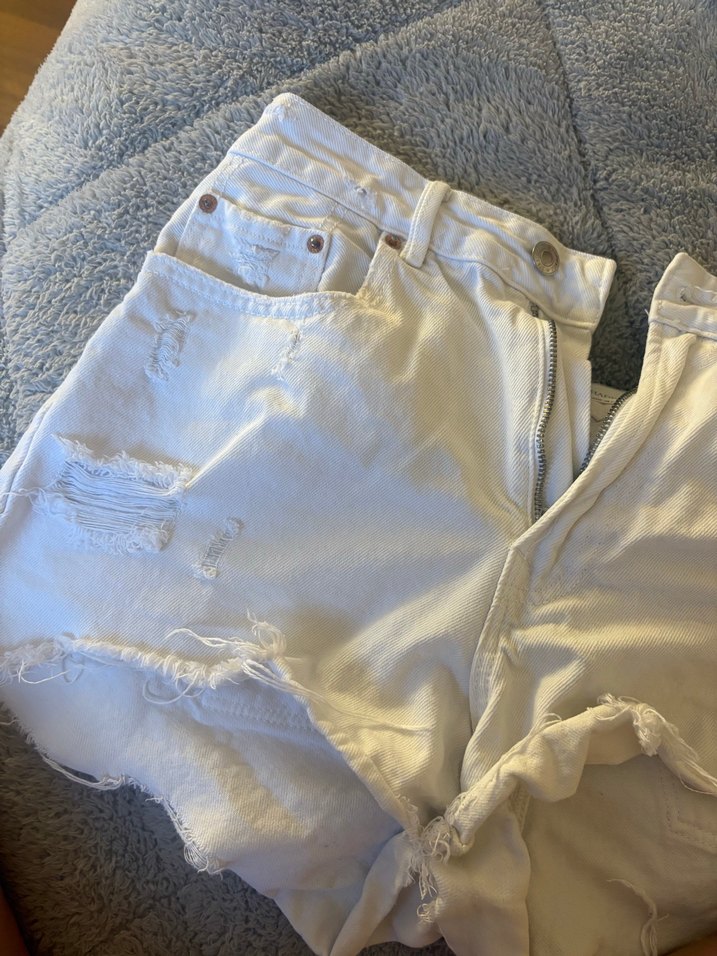 Beyaz kot şort, gevşek kesim ve düğmeli kapanışa sahiptir. Midi boyda, yırtık detaylarla gündelik rahat stil için uygundur.