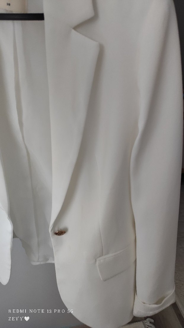 Bu beyaz kadın blazer ceket, kesimli yaka ve uzun kolludur. Normal kesim, midi boy ve parlak, ipeksi kumaştan yapılmıştır. Düğmeli ve desensizdir, ofis için klasik şıklık sunar. ✨ İade kabul etmiyorum