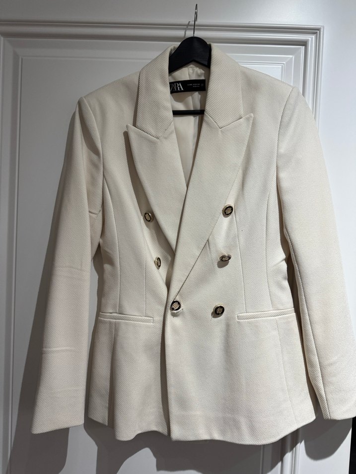 Beyaz renkli, düğmeli ve kesimli yakaya sahip kadın blazer ceket, normal midi boyda ve belden oturmalı .Sentetik kumaştan üretilmiş, modern klasik ofis stili sunar.