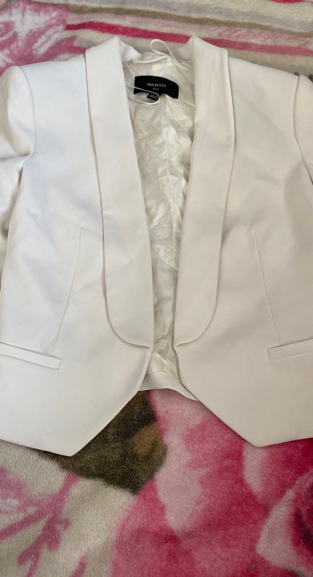 Düğmeli, yakalı ve uzun kollu beyaz kadın blazer ceket. İnce kesim, satenimsi dokuda ve parlak yüzeylidir. Ofis için uygun, klasik şıklıkta midi boy.