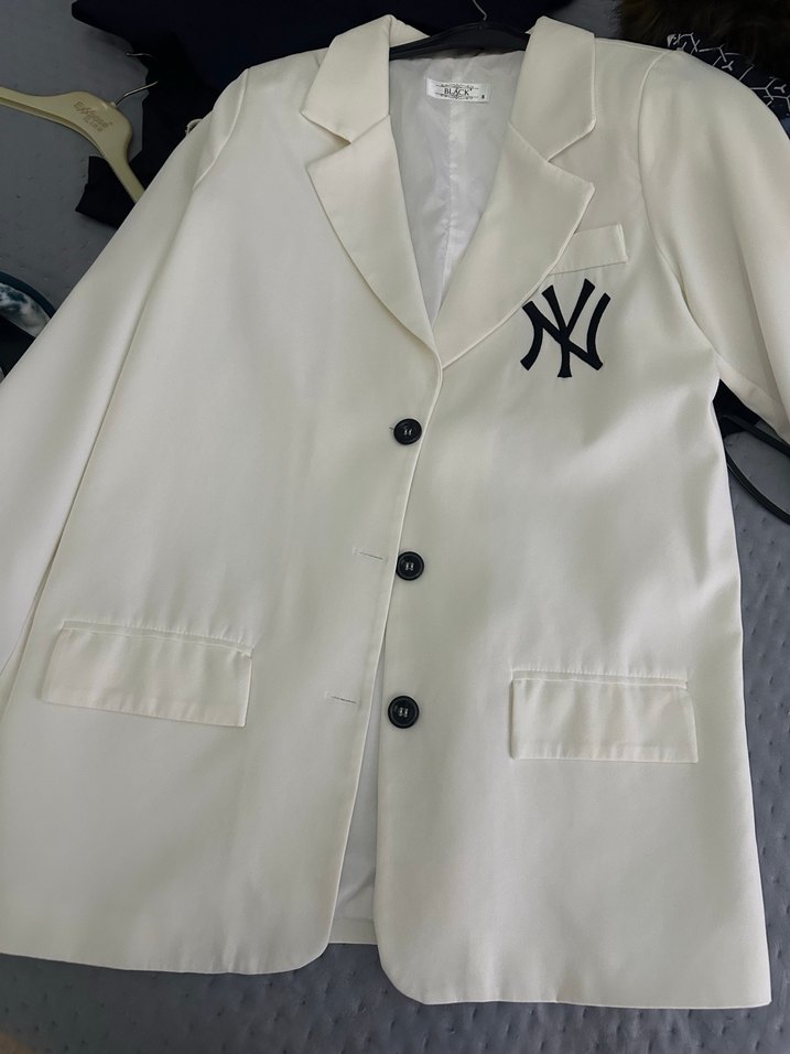 Beyaz kadın blazer, düğmeli ve uzun kollu. Normal kesim, baskılı detaylı, ofis ve günlük kullanıma uygun. Sentetik kumaştan üretilmiştir.