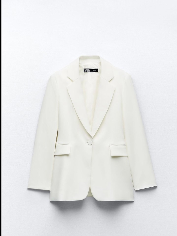 Bu beyaz blazer, düğmeli ön kısmı ve kesik yaka detayıyla, ipeksi kumaştan üretilmiş, normal kesim ve uzun kolludur. Modern klasik tarzda, ofis için uygundur. Kuru temizlemeye verilmiştir. Ürün temizdir.