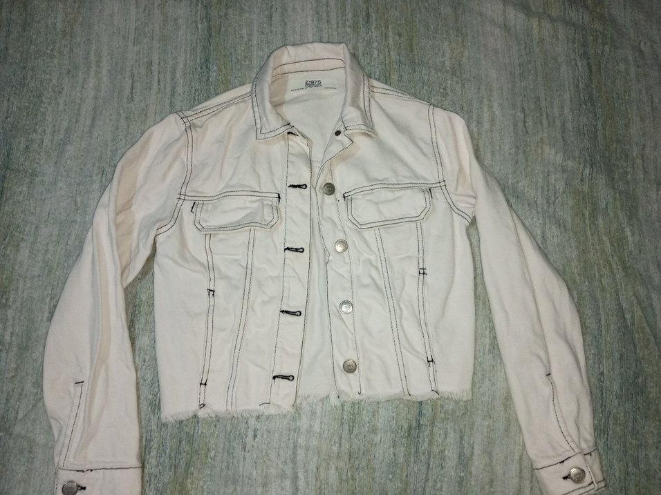 Beyaz renkte, düğmeli ve uzun kollu, kısa kadın kot ceket. Notch yaka ve desen içermeyen tasarımıyla günlük kullanıma uygun.