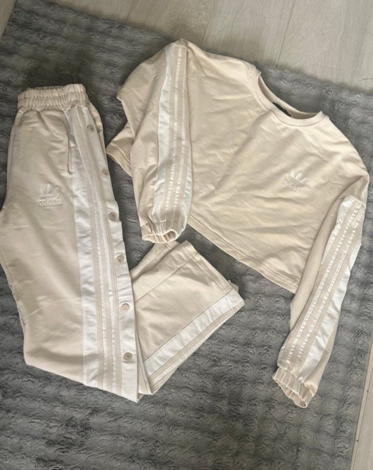 Yumuşak pamuk kumaştan, düğmeli yan detaylı, uzun kollu ve beyaz renkte, bol kesim kadın eşofman takımı. Günlük sokak modası için ideal.